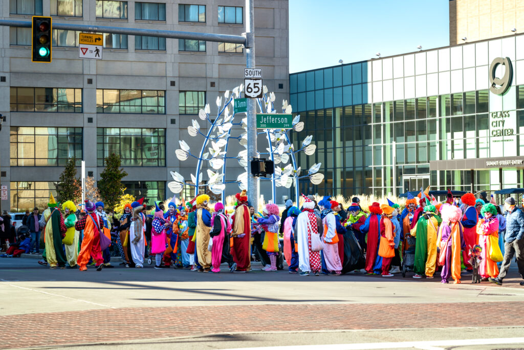 Over 36 years ago, Toledo businessman and community leader Wally Iott, former Foodtown COO, was approached to re-create the Holiday Parade during the Thanksgiving season. Inspired by the success of similar groups across the country, Wally introduced the idea of the Distinguished Clown Corps (DCC) — local business executives sponsored by their companies to become a “clown for the day,” marching in the parade in colorful costumes and handing out candy and balloons to children and families along the route.